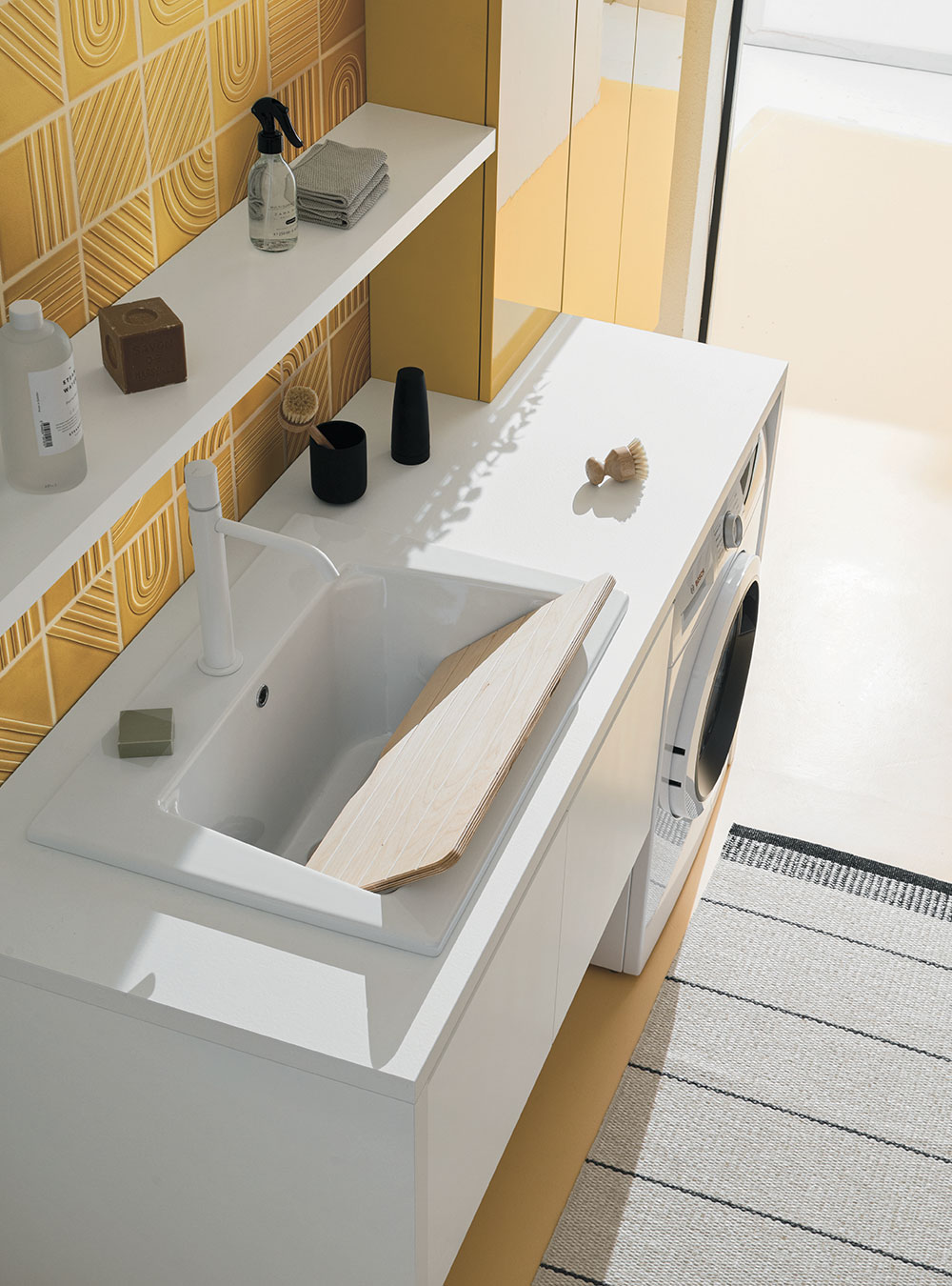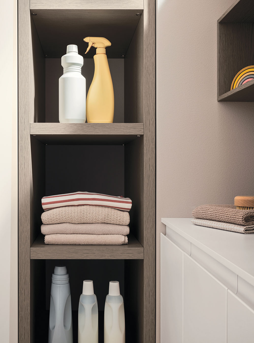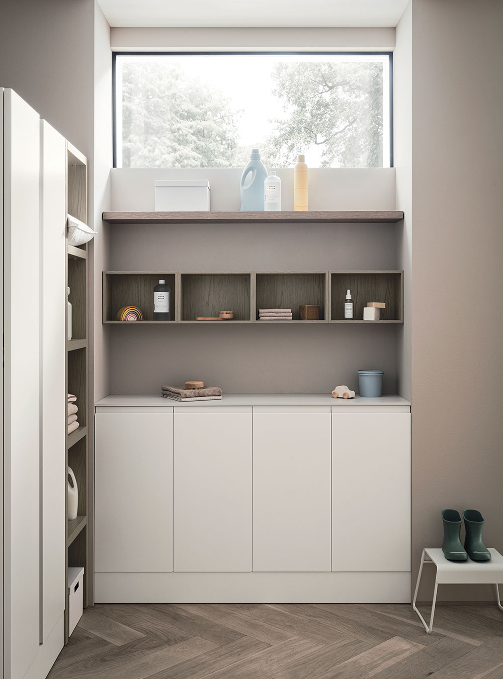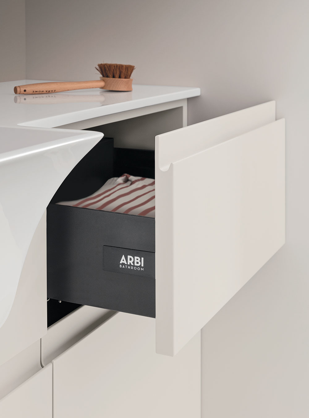Arbi предлагает различные решения для интерьера постирочной: просторные и модульные тумбы, вместительные контейнеры, универсальные шкафы, раковины, созданные с характеристиками эстетической привлекательности, функциональности и долговечности. Постирочная, в своей функции обслуживания, с Bolle сохраняет всю свою красоту, проект, организующий и улучшающий техническое помещение, превращая его в наполненное функциями и ощущениями место. Универсальная и аккуратная коллекция, предлагаемая с гладкой дверцей и дверцей J, в многочисленных вариантах отделки из термоструктурированного меламина, а также матовый лак, velvet и глянцевый.