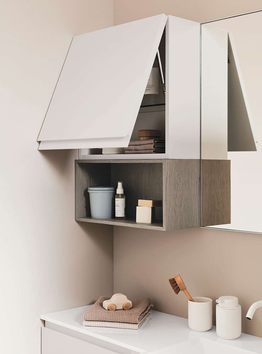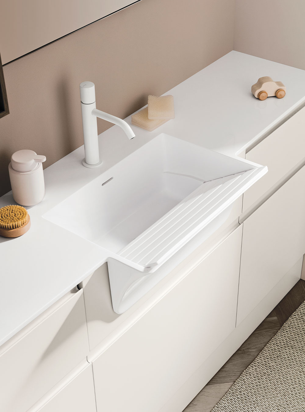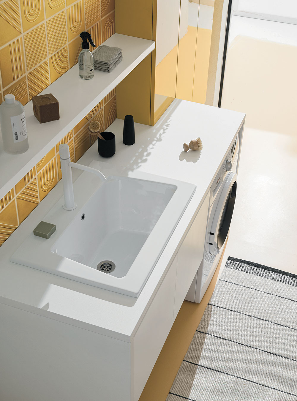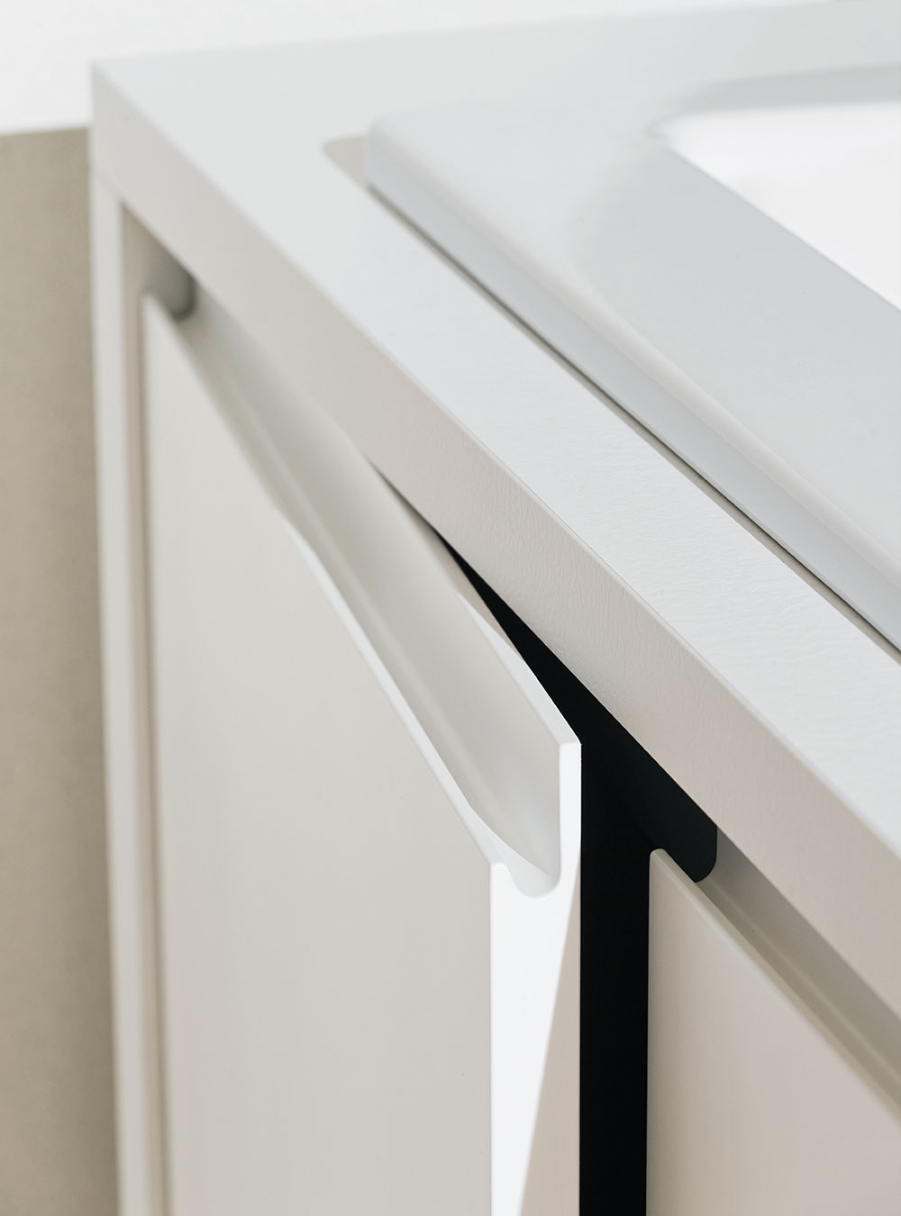 Arbi предлагает различные решения для интерьера постирочной: просторные и модульные тумбы, вместительные контейнеры, универсальные шкафы, раковины, созданные с характеристиками эстетической привлекательности, функциональности и долговечности. Постирочная, в своей функции обслуживания, с Bolle сохраняет всю свою красоту, проект, организующий и улучшающий техническое помещение, превращая его в наполненное функциями и ощущениями место. Универсальная и аккуратная коллекция, предлагаемая с гладкой дверцей и дверцей J, в многочисленных вариантах отделки из термоструктурированного меламина, а также матовый лак, velvet и глянцевый.