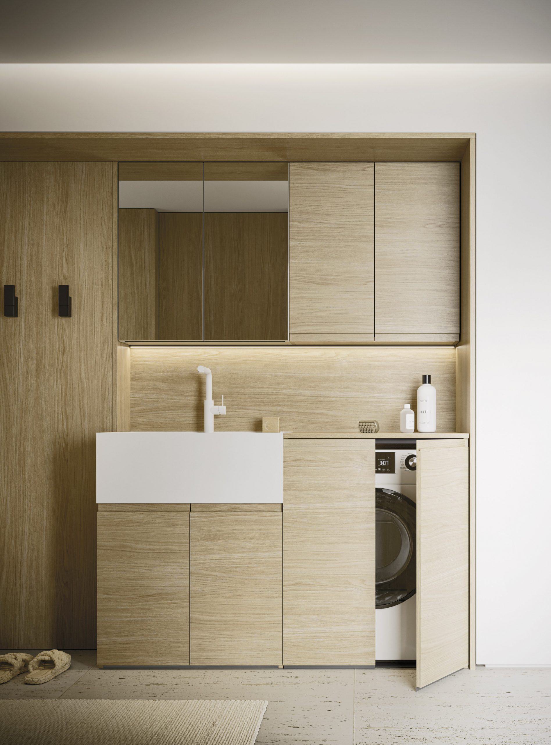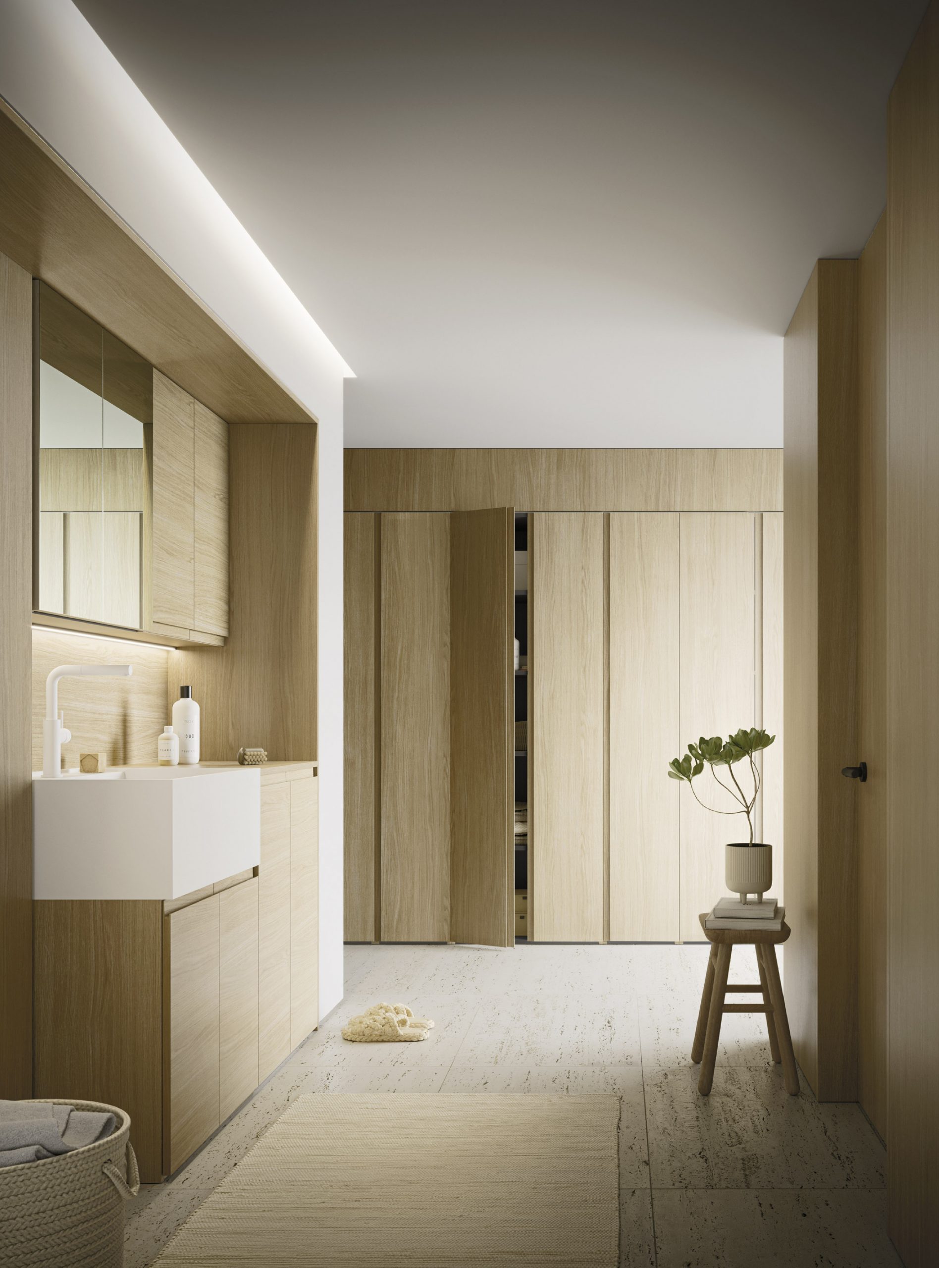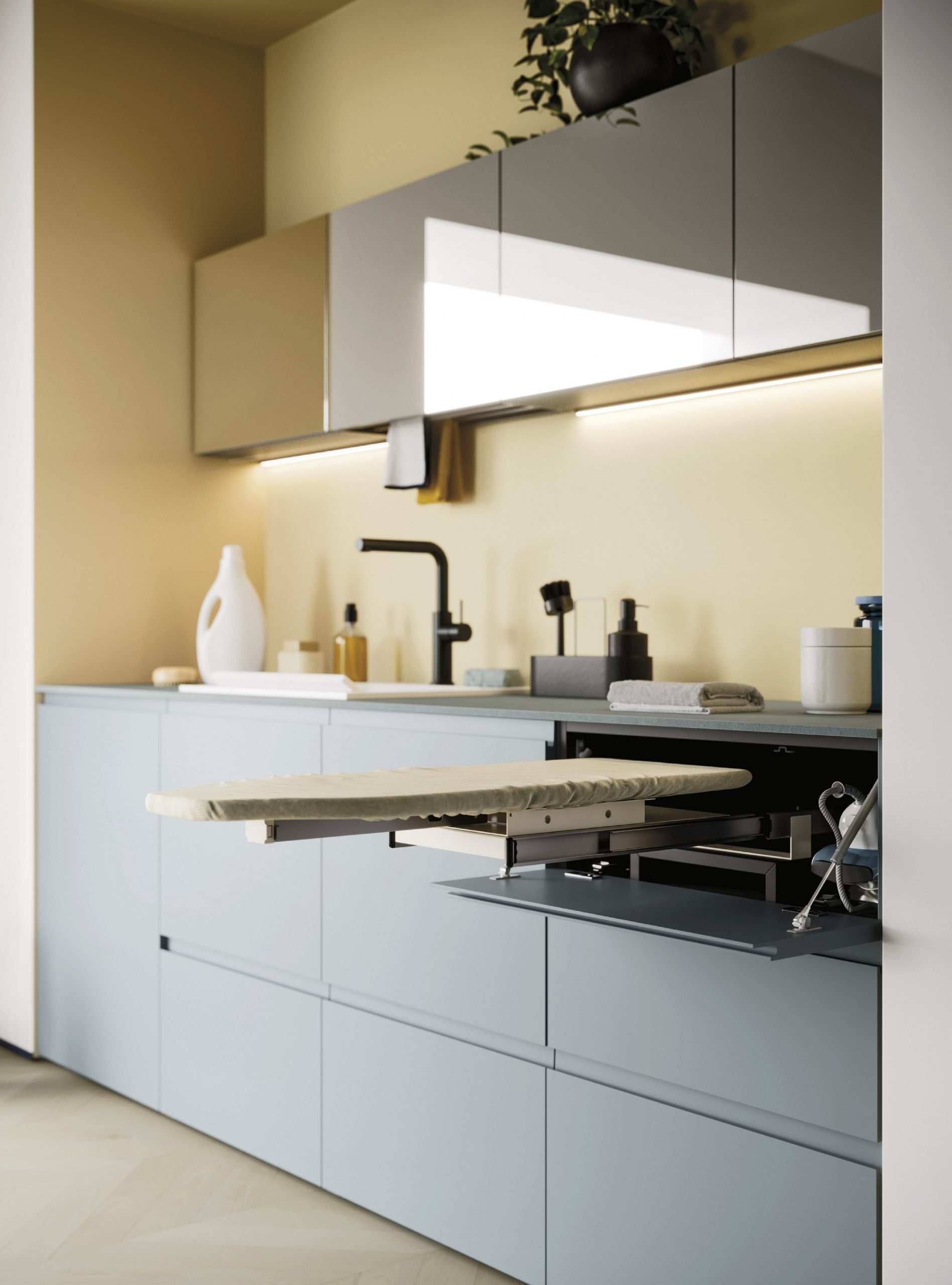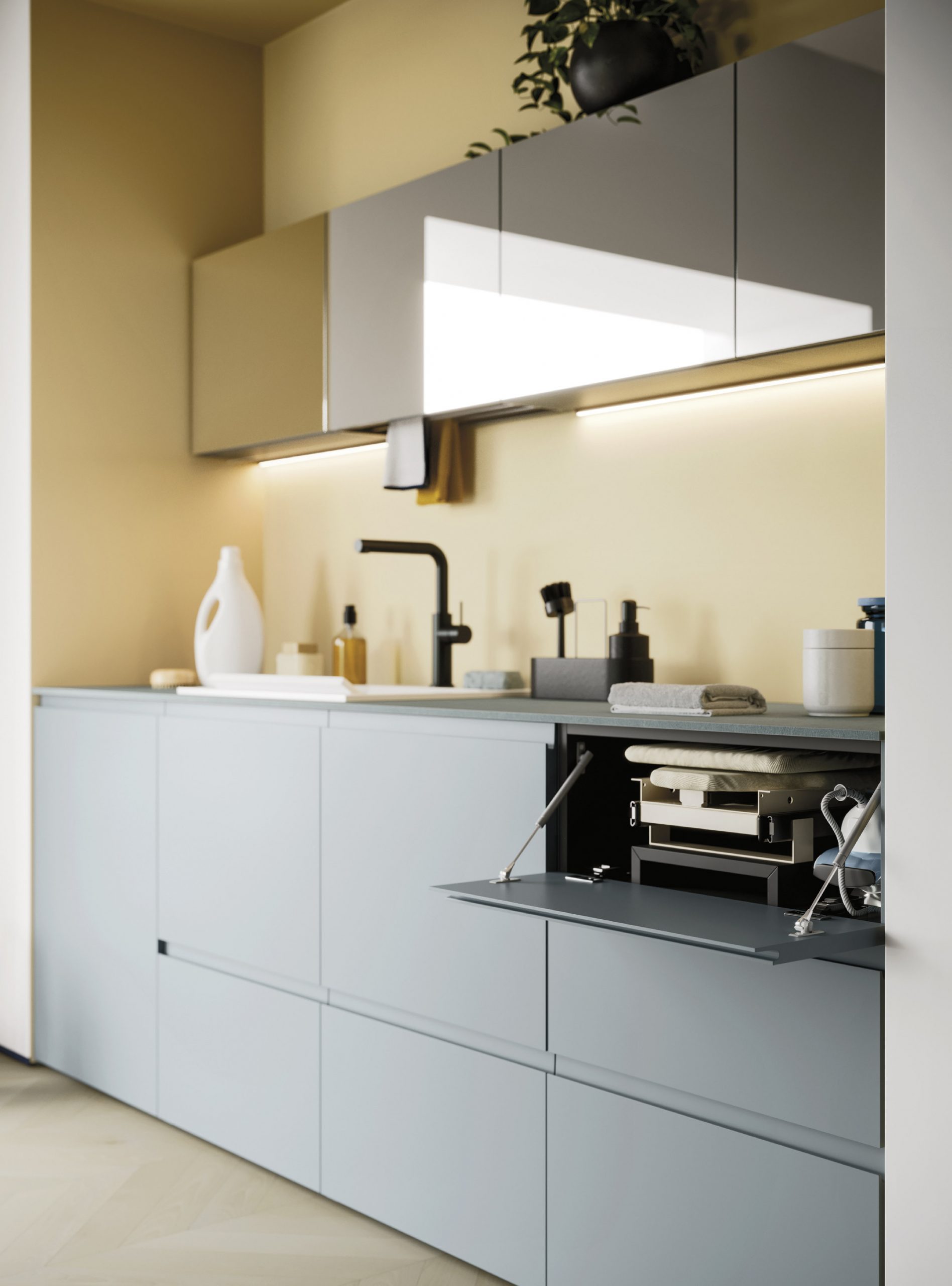 Arbi предлагает различные решения для интерьера постирочной: просторные и модульные тумбы, вместительные контейнеры, универсальные шкафы, раковины, созданные с характеристиками эстетической привлекательности, функциональности и долговечности. Постирочная, в своей функции обслуживания, с Bolle сохраняет всю свою красоту, проект, организующий и улучшающий техническое помещение, превращая его в наполненное функциями и ощущениями место. Универсальная и аккуратная коллекция, предлагаемая с гладкой дверцей и дверцей J, в многочисленных вариантах отделки из термоструктурированного меламина, а также матовый лак, velvet и глянцевый.