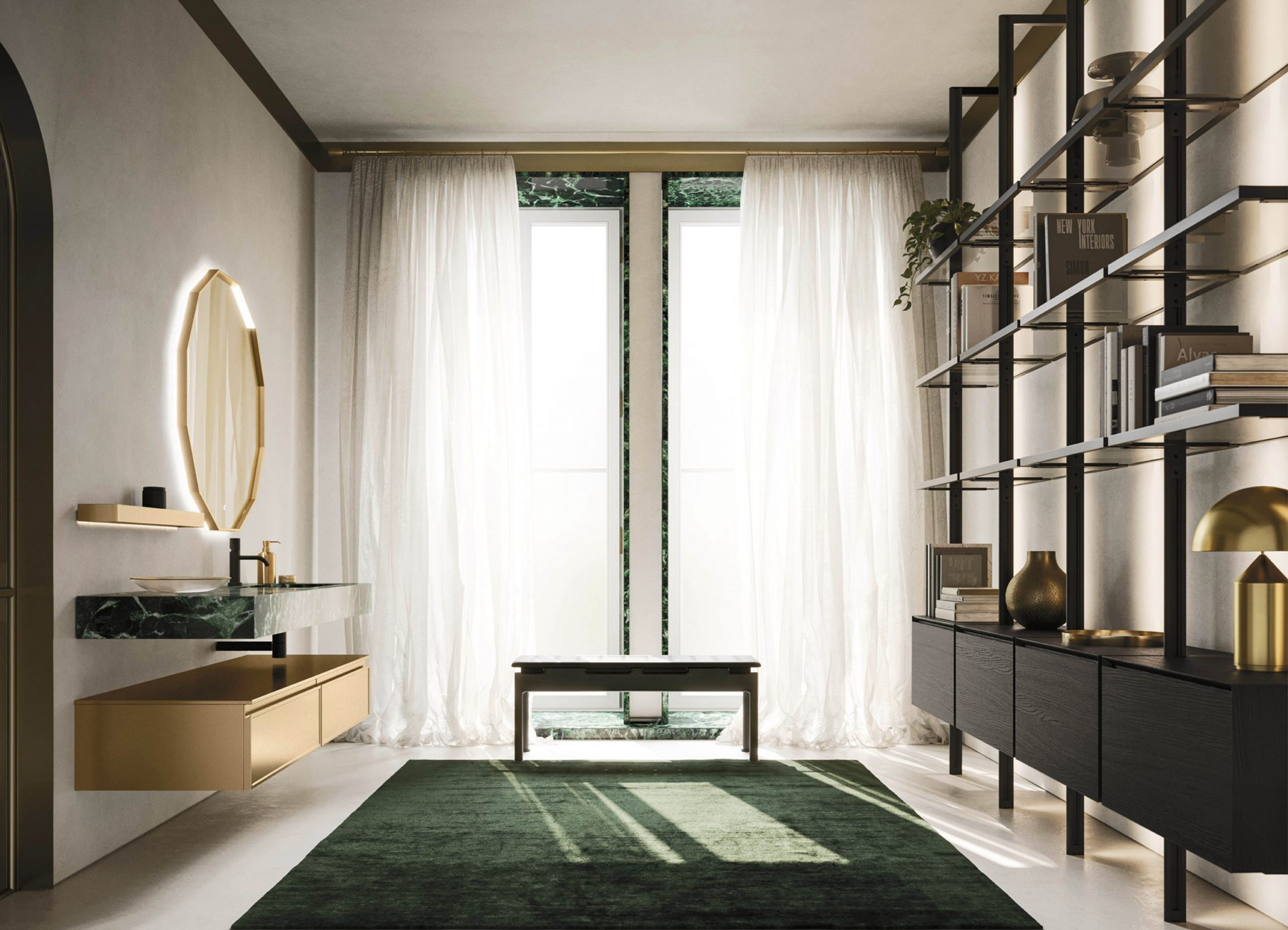 Elements Modular structure with grey glass shelves and black aluminium pillars