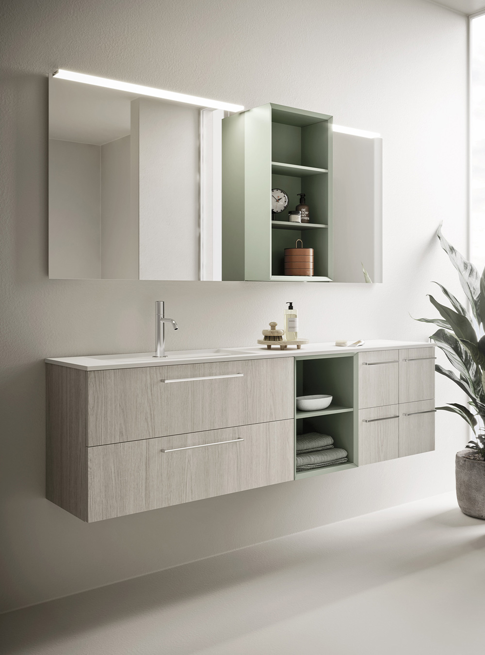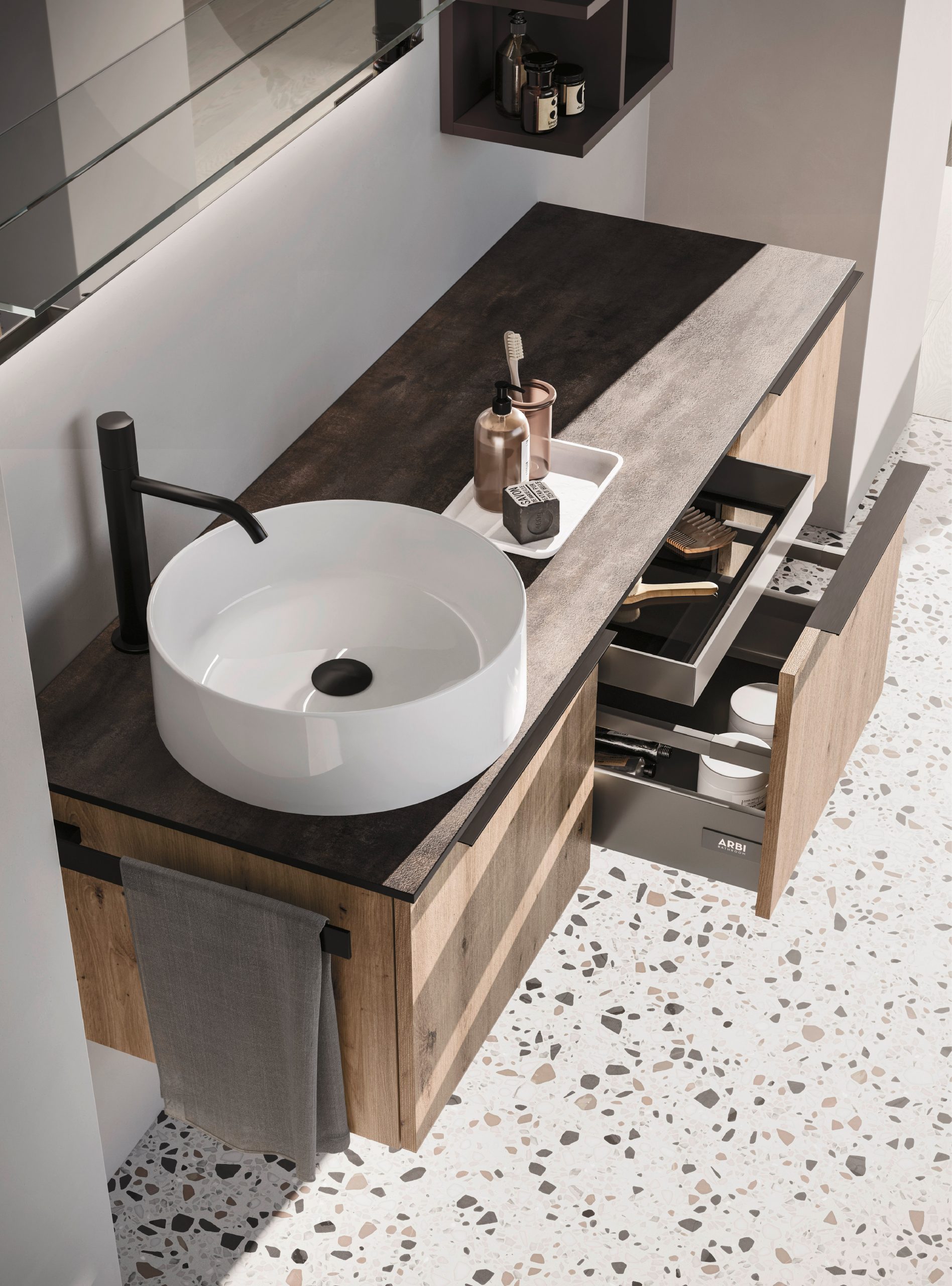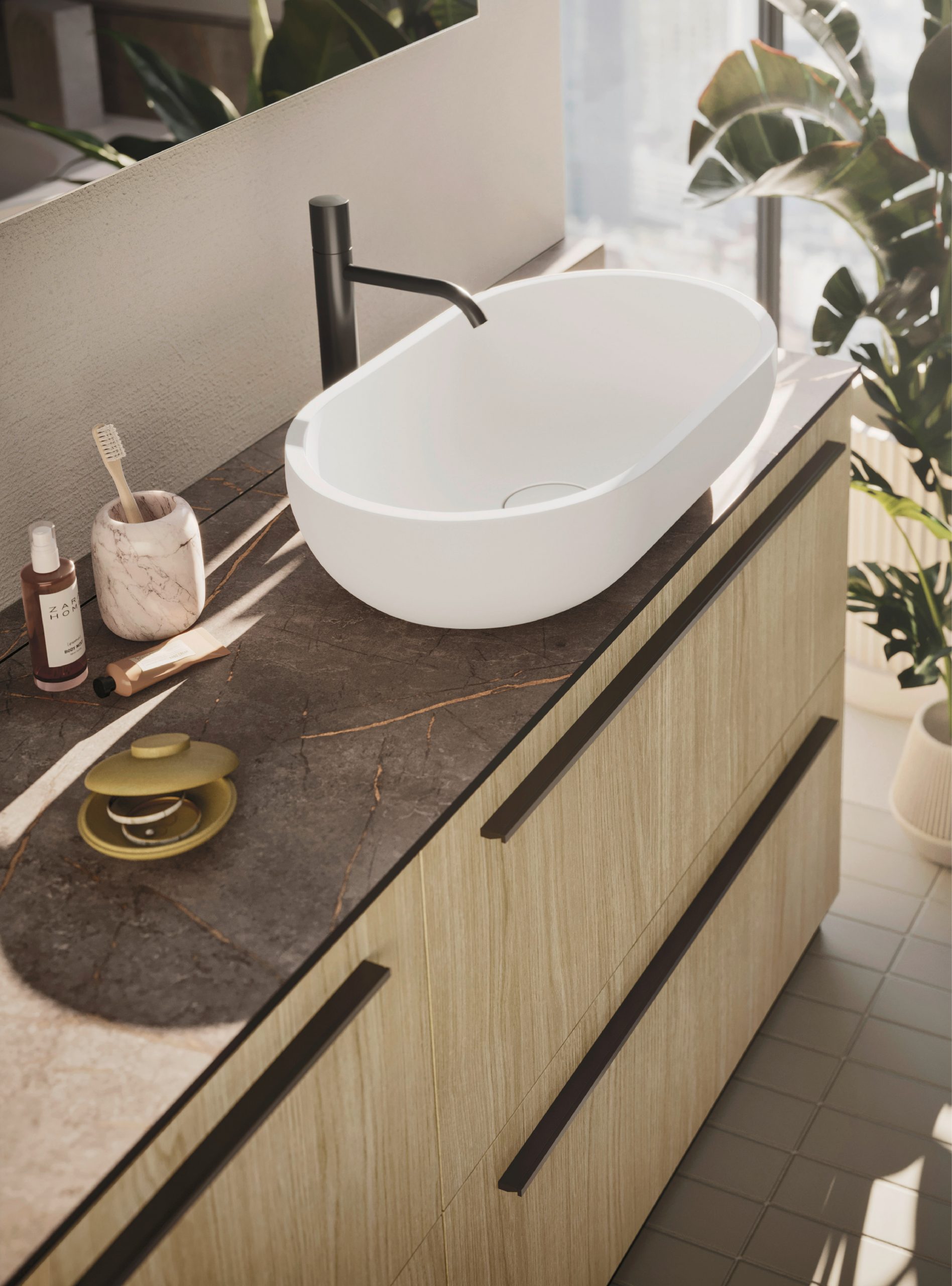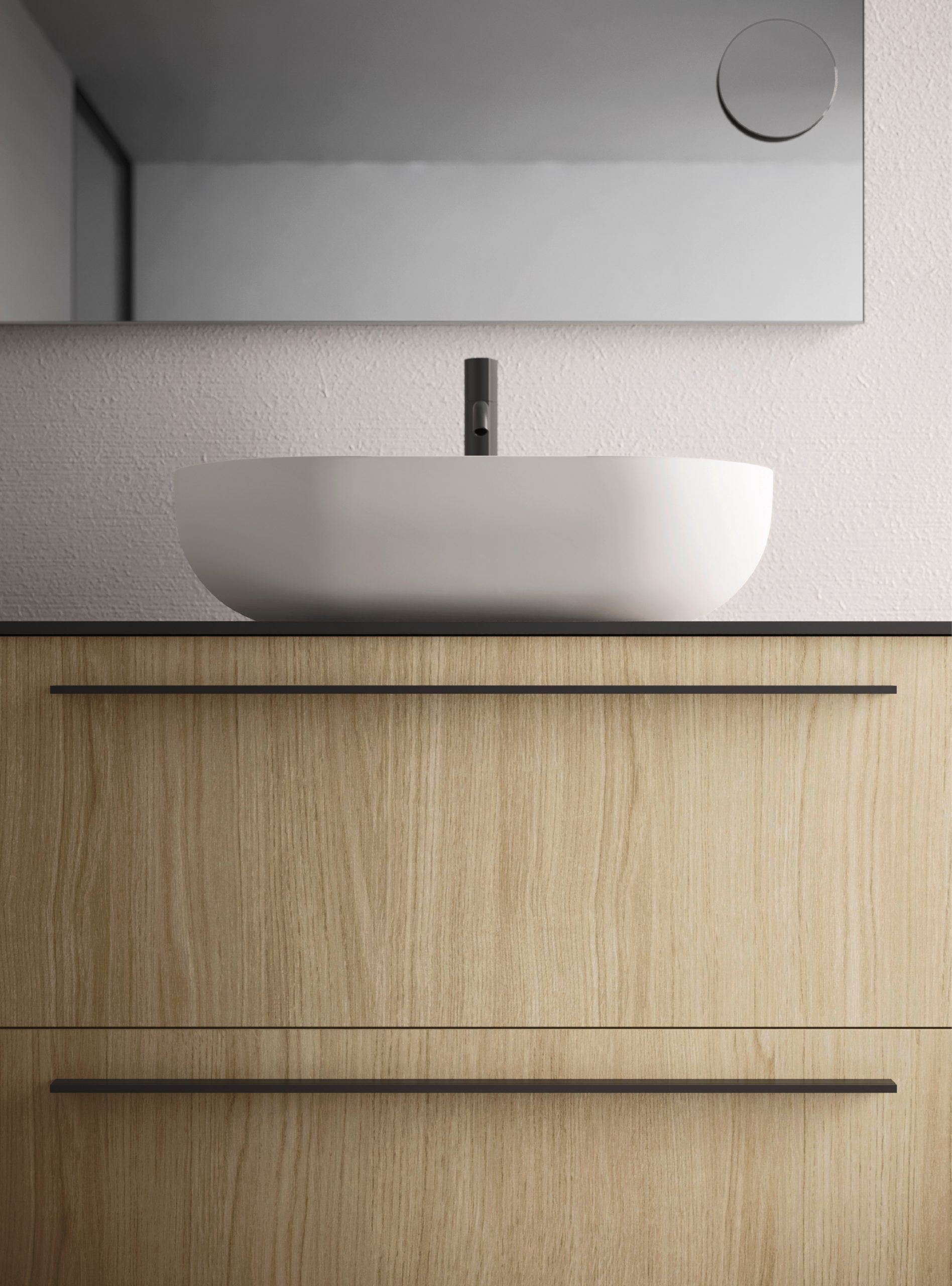 Ho.Me Plus è un’inedita collezione firmata Arbi Arredobagno che raccoglie una vasta gamma di finiture in melaminico termostrutturato dalle venature naturali, ai colori classici o di tendenza. Trasversale nello stile, ho.me plus è disponibile in due varianti: una con anta con maniglia, l’altra con presa maniglia «J» integrata. Flessibile nell’ambientazione grazie alla scelta fra tre profondità e diverse larghezze, la collezione è arricchita dalla versione curva, che propone basi dalle linee morbide per soddisfare anche le esigenze di ottimizzazione degli spazi più ristretti.